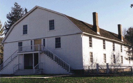 The first colony religious services at the Bishop Hill Colony were held in a tent built of logs and canvas. The tent was destroyed by fire and the three-story Colony Church was built during the summer of 1848.