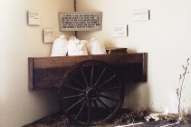 By 1848, the Colonists began firing their own brick, using clay from the nearby Edwards River. The Bishop Hill Colony Big Brick, built 1849-1851, was a 4-story, 96-room residence hall located a few blocks from the church. The building burned in 1928, but photos can be seen in the museum. Included in this display are bricks signed, initialled or decorated by the women, children who made brick, as well as a colony dog.