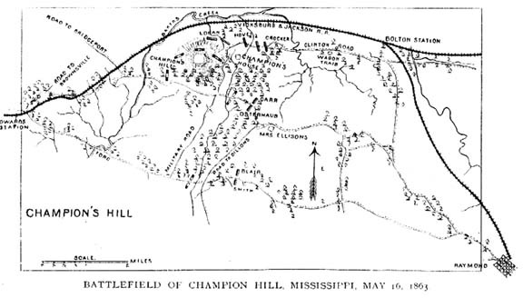 Just at sunrise the Ninety-Third Illinois resumed its march toward Vicksburg. After numerous delays along the road, the command had marched no more that three or four miles when the sound of cannon, in front, foretold the battle. After marching eight miles, the scene of the conflict at Champion Hill, Mississippi, was reached. The battle was fought about three and a half miles southeast of Edward's Station, south of the Vicksburg & Jackson Railroad, on the hills and through the ravines along the left bank of Baker's Creek. There was a road, running in a course north-northwesterly, from Raymond to Bolton, the latter being a small railroad station. Departing from or crossing that road, at different points between Raymond and Bolton, were three other roads, running toward Edward's Station. The longest of these three roads left the Raymond and Bolton road a little more than a mile north of Raymond and ran in a tolerably direct line to Edward's Station, the course being about west-northwest. The middle road was about two miles farther north, and the third about four miles north of the middle one and about one mile south of Bolton. The middle road intercepted the south one a half mile east of Edward's Station. The north road intercepted the middle one about three miles farther east.